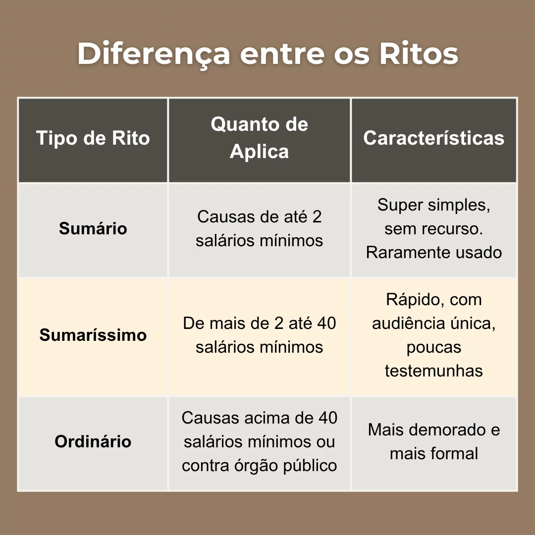 Aplica-se quando o valor da causa está entre mais de 2 e até 40 salários mínimos. A audiência é única e acontece rápido. Cada parte pode levar até 2 testemunhas. O processo é mais direto, com menos etapas e formalidades. É o mais usado em causas trabalhistas de menor valor.